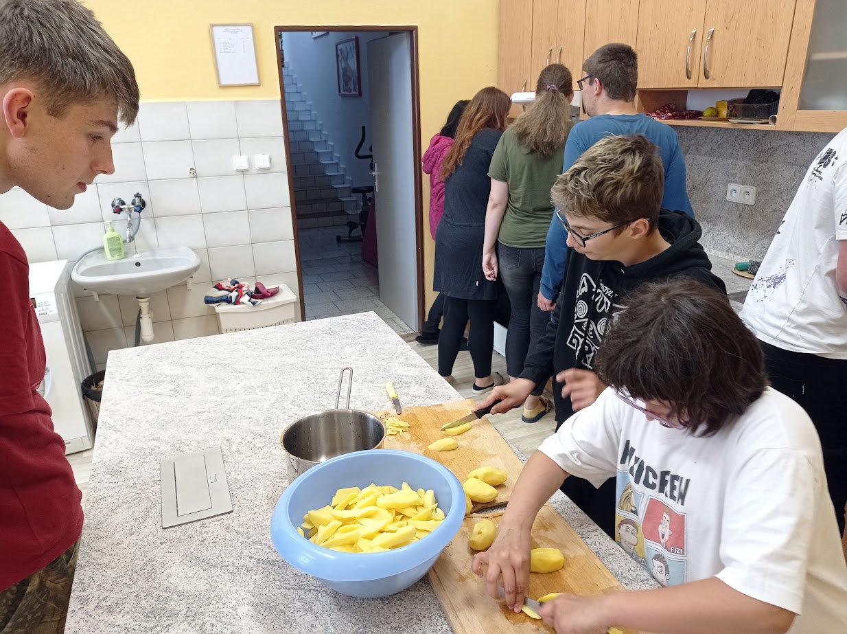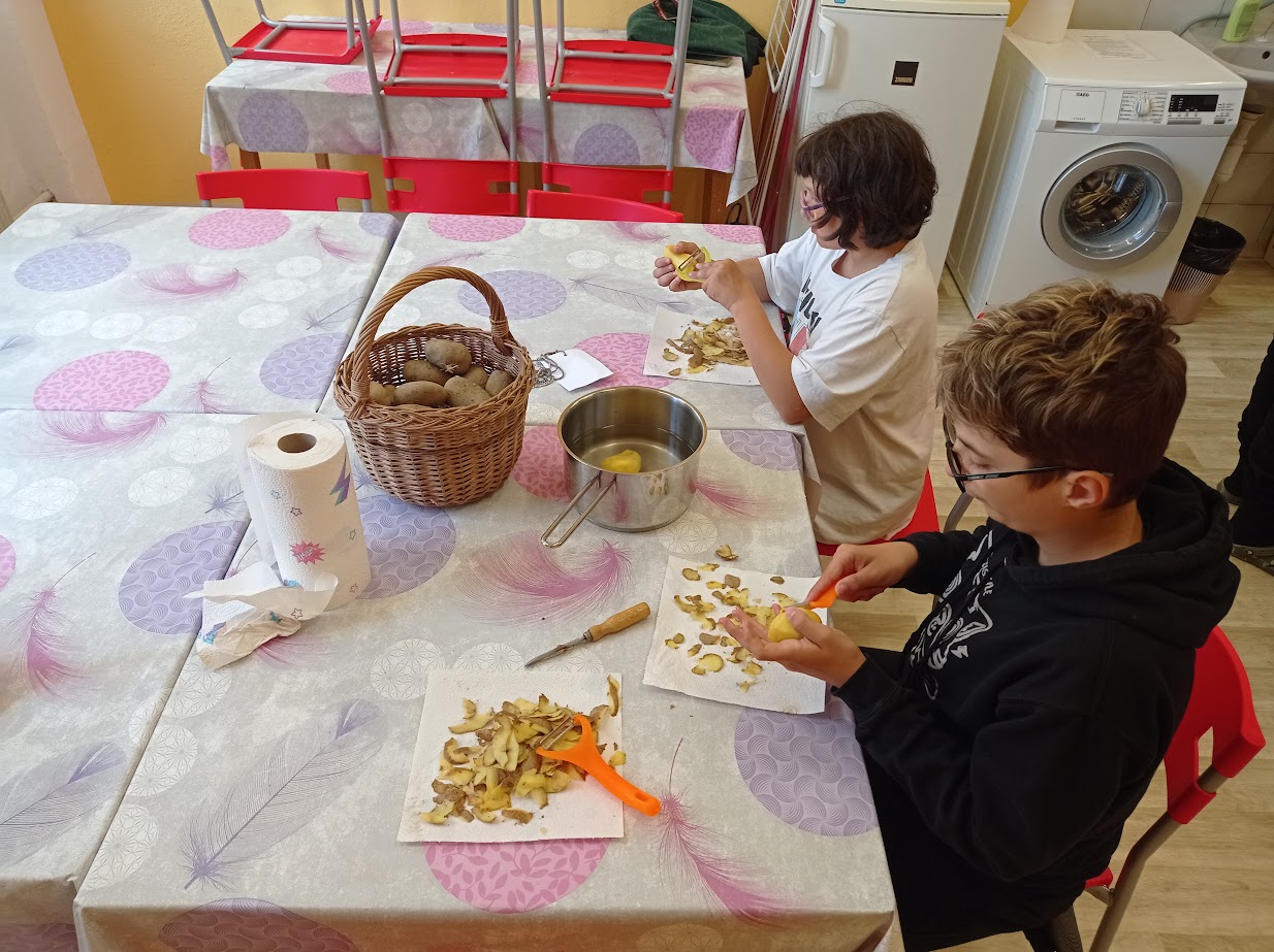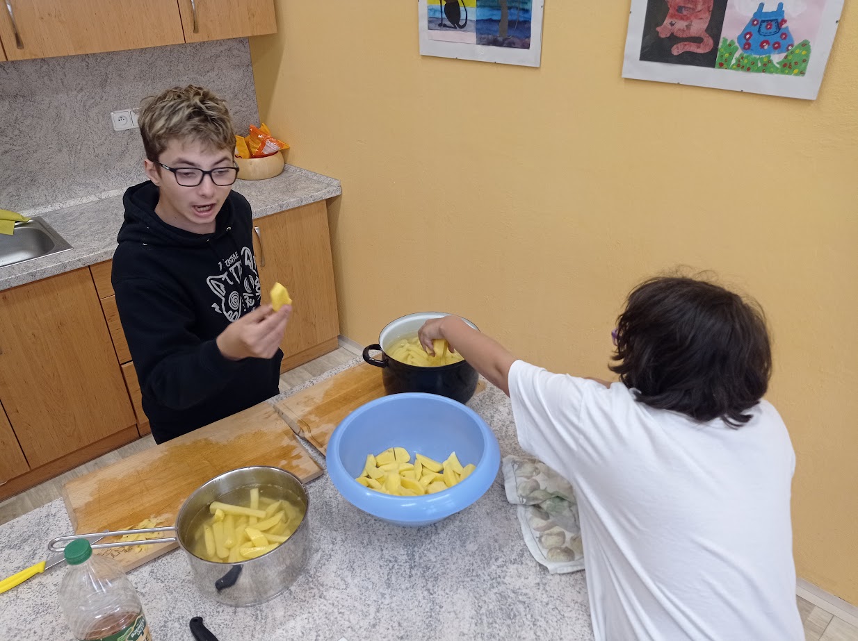 Vysněné hranolky našeho žáka. V pracovních činnostech jsme smažili hranolky a pozvali jsme na ně i žáky ze IV. třídy. U loupání brambor jsme si hezky povídali, pak jsme je umyli a následovalo krájení. To byl zážitek! Opatrně, abychom jsme se neřízli! Brambory jsme zvládli nakrájet (líbilo se nám, jak každá měla úplně jiný tvar - stejně jako člověk...každý je úplně jiný, každý je originál, a tak je to správně...tak to má být). Podle receptu jedné maminky našeho žáka, jsme chvíli vařili brambory v octové vodě. A až poté jsme brambory smažili. Musím říct, že hranolky byly opravdu delikatesa.
